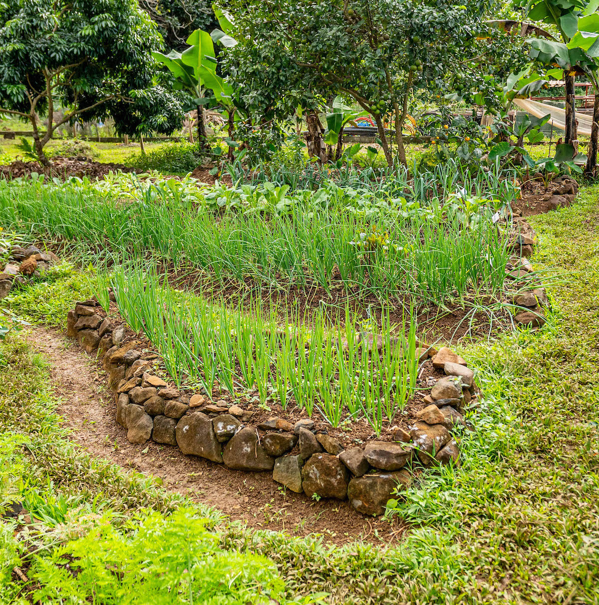 Les cultures se font en partie sur buttes surélevées pour les légumes fins, et en partie en plein champs pour les légumes plus robustes et pour les filants.